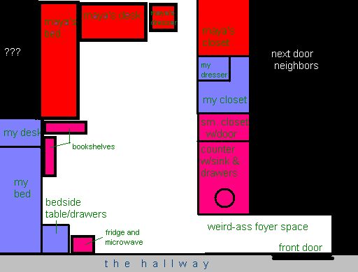 Saturday was golf day. Maya and I cleaned and rearranged our room (I'm drawing another diagram in MSpaint). Kate, Robert, and I were 70s punks. Golf was okay, but there were tons of people and too many holes. It just wasn't as fun as all the other times. Kate got kinda ill and I called Ted to come and help me take care of her since I realized there wasn't much more I could do and I was just standing there awkwardly eating packet after packet of pop rocks. Everyone had mostly passed out by 1am, which is pretty sad. I found a few people and we hung out in French House before heading to bed by 2. All in all, I was drunker and had more fun Friday, which leads me to believe I no longer enjoy big parties.